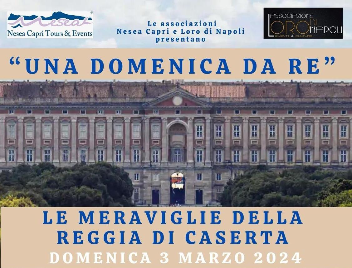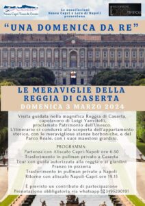 Vi aspettiamo domenica 3 marzo 2024 con un nuovo interessante appuntamento per vivere “Una domenica da Re” all’interno della straordinaria Reggia di Caserta. Prenotazione obbligatoria – e’ previsto un contributo di partecipazione 👑