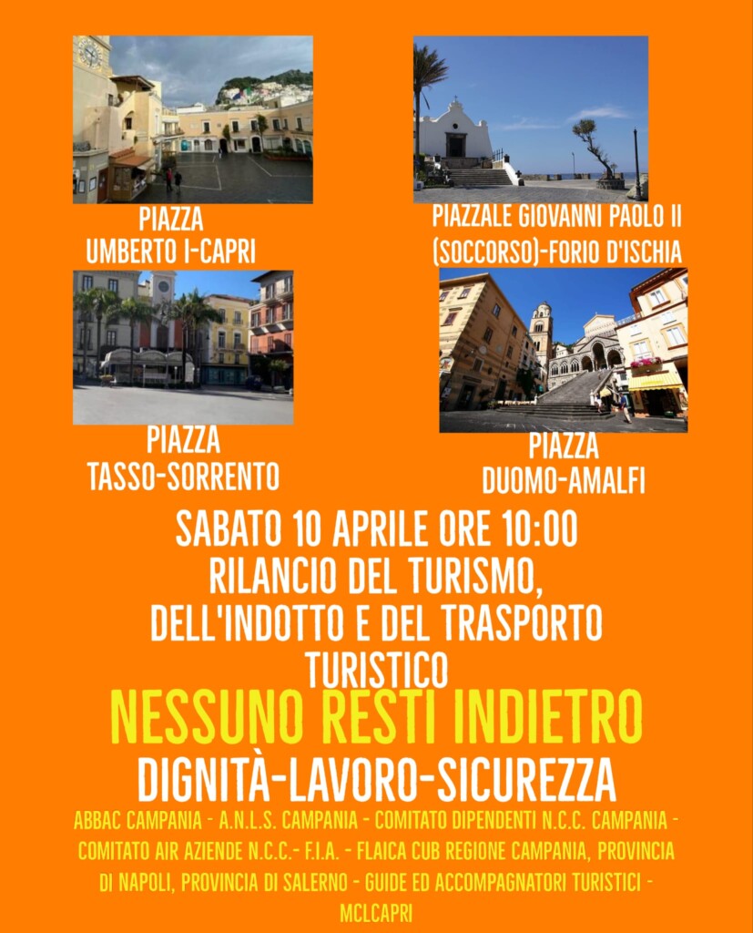 Sabato 10 aprile alle ore 10.00, manifestazione dei lavoratori del turismo, e non solo, in piazza Umberto I a Capri. “Nessuno resti indietro – dignità – lavoro – sicurezza” è il tema della protesta per il rilancio del turismo, dell’indotto e del trasporto turistico che richiamerà in piazza anche diverse sigle e categorie del comparto turistico: Abbac Campania, ANIS Campania, Comitato dipendenti NCC Campania, Comitato Air Aziende NCC – FIA, Flaica Cub Regione Campania, Provincia di Napoli, Provincia di Salerno, Guide ed Accompagnatori Turistici, MCLC Capri.