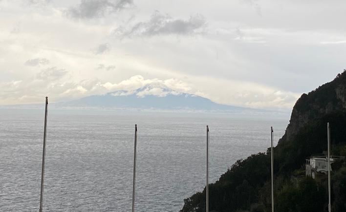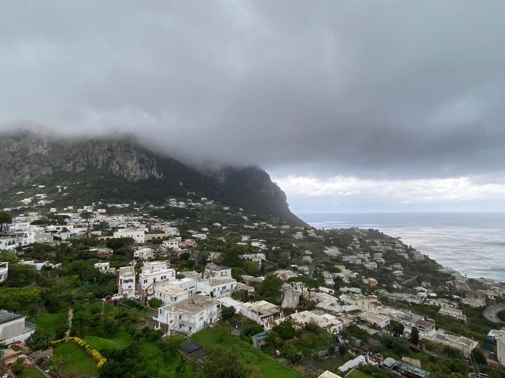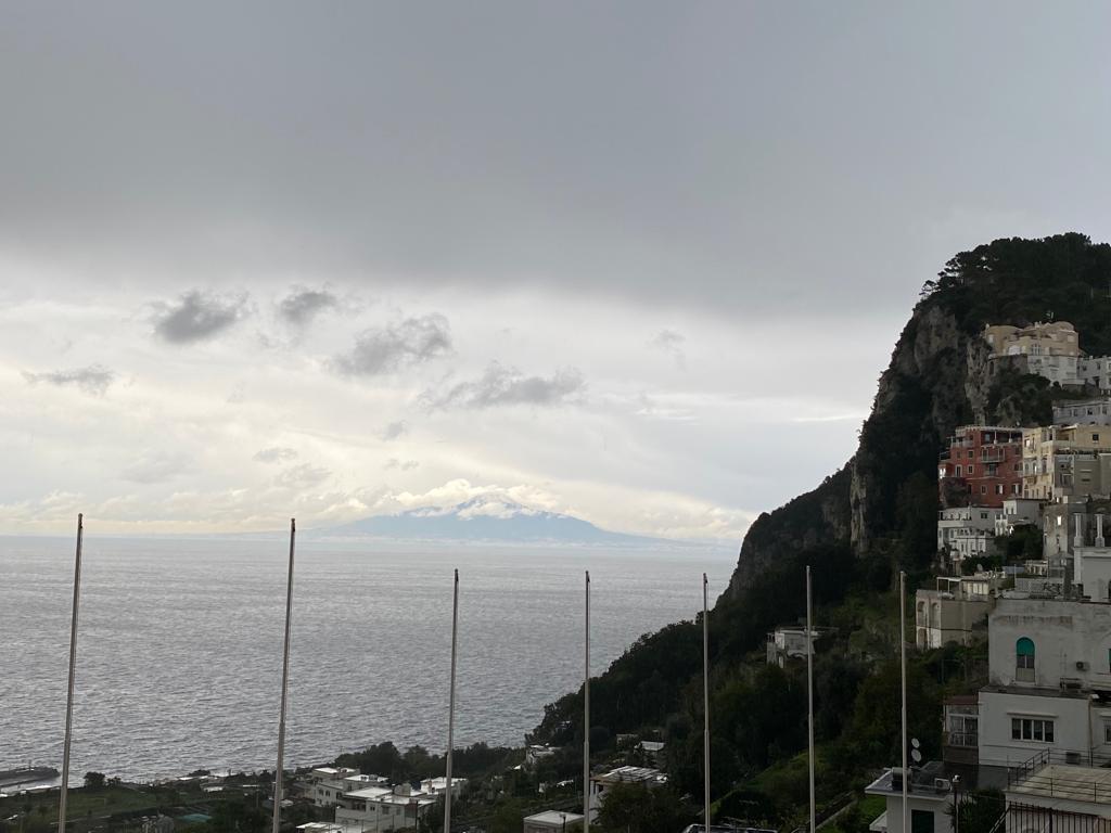 La pioggia che è caduta abbondante sull’isola e il vento che man mano durante la giornata è andato calmandosi ha consentito la ripresa seppure a singhiozzo i collegamenti marittimi tra Napoli, Capri e sorrento. La prima partenza è stata effettuata dalla motonave veloce Caremar alle 5:40 da Calata di Massa diretta a Capri per la ripartenza per sorrento alle 7:00. Una corsa che viene molto utilizzata dai pendolari che viaggiano tra Capri e la terraferma. Ma nonostante la pioggia e il vento, il Vesuvio questa mattina si è presentato in un insolito aspetto con la cima innevata e ricoperta di bianco che faceva da contrasto con il grigiore del mare e del cielo. Il biancore del Vesuvio riuscito a rendere la scena suggestiva in una Capri resa grigia dai toni e colori invernali.