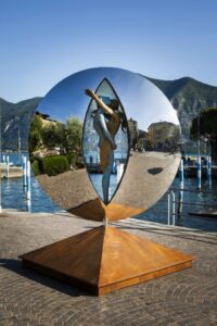 Un’ imponente scultura in bronzo di quasi tre metri di altezza dall’evocativo titolo ” Travolti dalla luna”: due amanti colti in un romantico abbraccio.