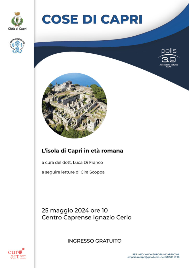 Sabato 25 alle ore 10 nella sala conferenze del Centro Cerio si terrà il secondo appuntamento della rassegna Cose di Capri: L’isola di Capri in età romana, a cura del dott. Luca Di Franco, a seguire letture di Cira Scoppa.