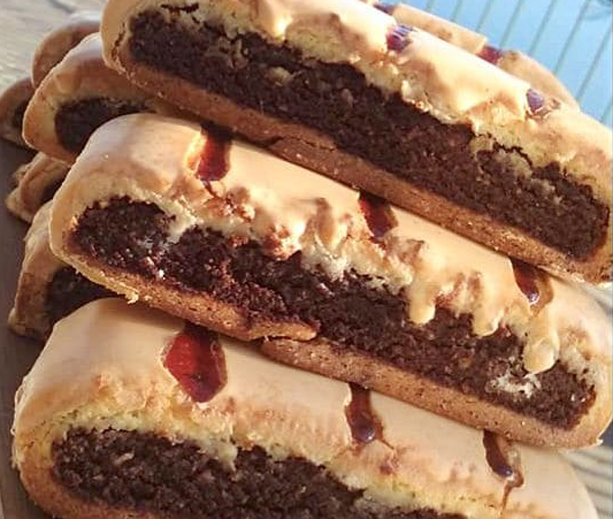 Il biscotto all’amarena, “u biscuttin” per i sostenitori del vernacolo è il trionfo del riciclo? L’idea di riutilizzare “gli avanzi” di pasticceria per dare vita ad un pasticcino di pasta frolla piuttosto secco ma sufficientemente “umido” per essere piacevole e fragrante al momento della degustazione è stata partorita anni addietro in genuini laboratori di produzione dolciaria delle zone di Napoli e dintorni. “U biscuttin” infatti è immancabile dalle nostre parti, in ogni pasticceria, bar, ma anche forni-panetterie ben forniti, sia nei giorni feriali che festivi si trova in “vetrina” senza ombra di dubbio il biscotto all’amarena anche nella versione “mignon” da accompagnare ad un caffè. Meno facile da trovare da Roma in su, e se ci si dovesse imbattere in questo biscotto caratterizzato dalla glassa di copertura “rigata” da piccoli contributi di marmellata, miele, caramello o semplicemente “zucchero cotto” e ripieno di “nero” dal retrogusto “cioccolattoso” in molti lo definiscono “il napoletano” indicandolo come “biscotto napoletano” nella vetrina di presentazione dei dolci della giornata. Ma in realtà la disputa sulle origini del biscotto all’amarena è tutta da giocare e sull’argomento c’è da segnalare l’esistenza di un “biscotto Capri”. La ricetta come detto è fatta dal riciclo di pasticceria, dall’esigenza di smaltire senza gettare ritagli di altri dolci, torte, pan di spagna e pasticcini. La possibile primogenitura del biscotto all’amarena come “biscotto Capri” potrebbe però essere data dagli stessi ingredienti-avanzi utilizzati per la sua produzione che prevedono in molti casi anche ciò che di “superfluo” era a disposizione dei pasticcieri capresi durante la produzione della torta caprese. Un “patrimonio” di cioccolato e mandorle, tutto rigorosamente isolano, che farebbe pensare al “biscotto Capri” quale “papà” del biscotto all’amarena, ancor di più del “biscotto napoletano”. Origini partenopee o capresi, in ogni caso, oggi il biscotto all’amarena, fatto di pan di spagna od altri prodotti dolciari “secchi”, cacao, marmellata e “bagnato” di sciroppo di amarene in modo da formare un ripieno morbido e gustoso avvolto in un “contenitore” di pasta frolla dalla forma rettangolare, ricoperto da glassa e “decorato” con dolci strisce di marmellata in realtà oggi è ben più di un avanzo di laboratorio. E’ un dolce di produzione frequente, “apposita” e quasi quotidiana, l’indimenticabile Pino Daniele ne andava così ghiotto da farseli produrre su ordinazione, ed in molti ne fanno insieme agli altri dolci simbolo della tradizione meridionale un immancabile prodotto del quale essere sempre forniti per la loro clientela. Molto più dell’arte del riciclo, dunque, il biscotto all’amarena è simbolo dell’arte della…bontà e della buona pasticceria.