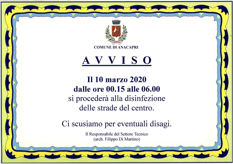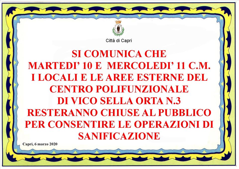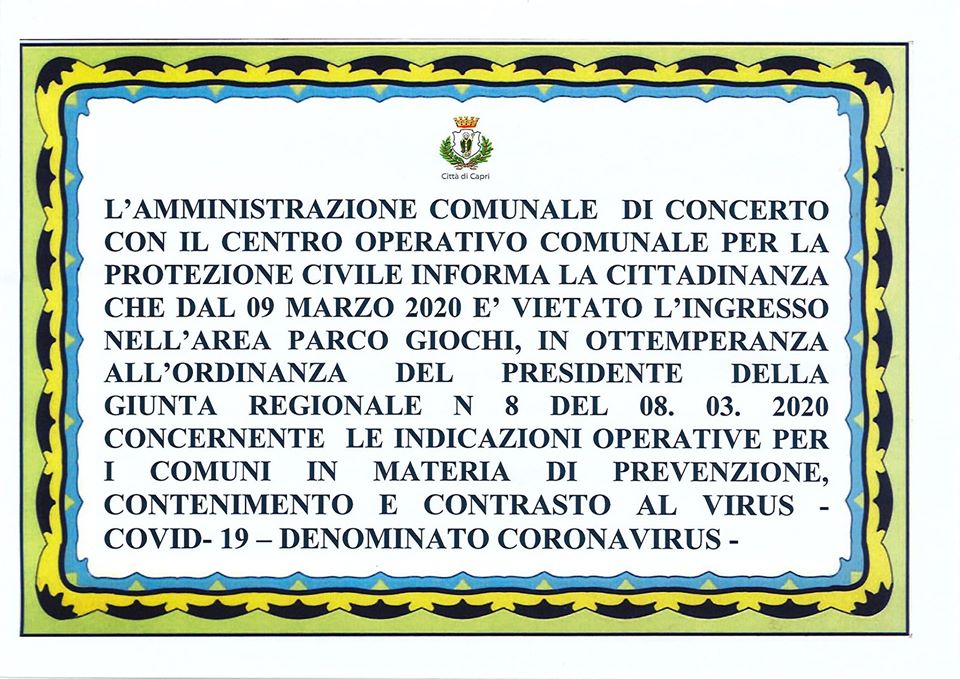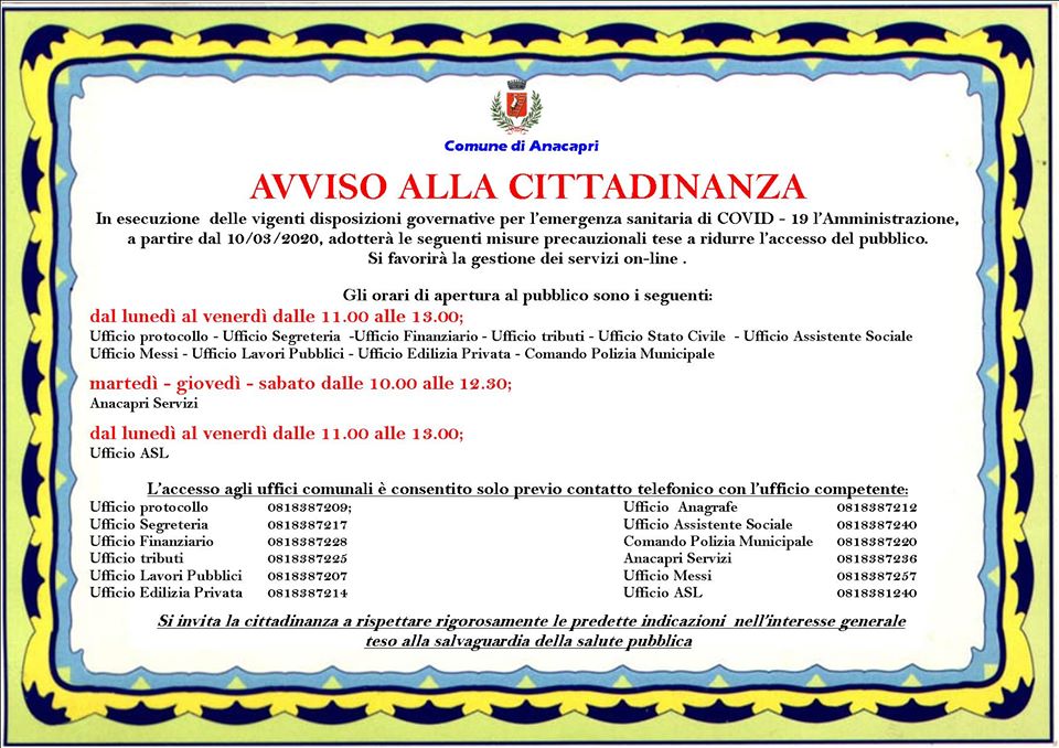 Il Comune di Anacapri ha anche comunicato che la Mediateca M. Cacace resterà chiusa fio al 3 aprile.