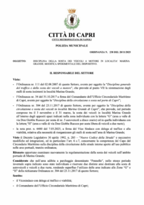 ORDINANZA DEL COMUNE DI CAPRI: DISCIPLINA DELLA SOSTA DEI VEICOLI A MOTORE IN LOCALITA’ MARINA GRANDE. MODIFICA SPERIMENTALE DEL DISPOSITIVO