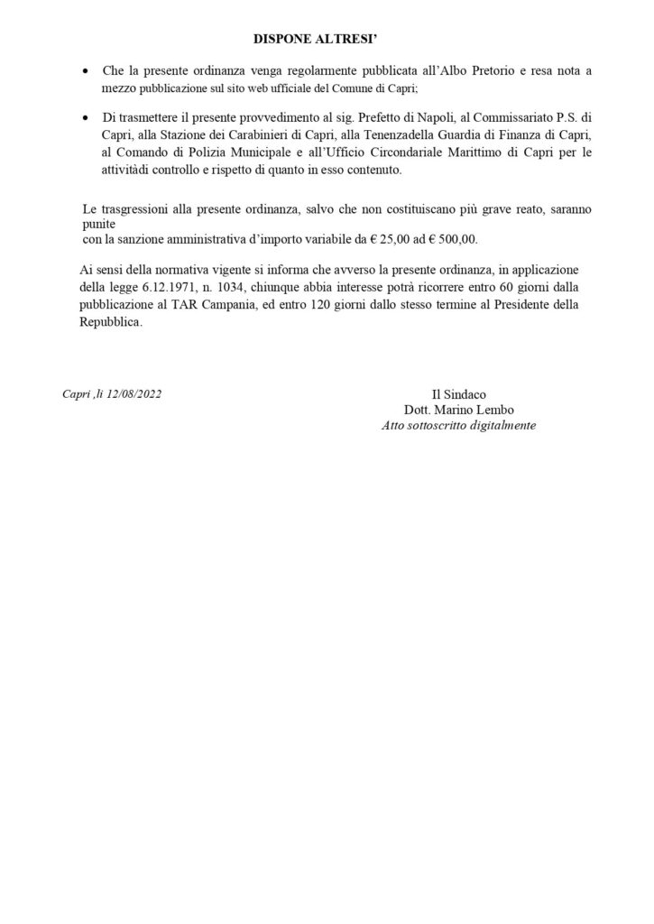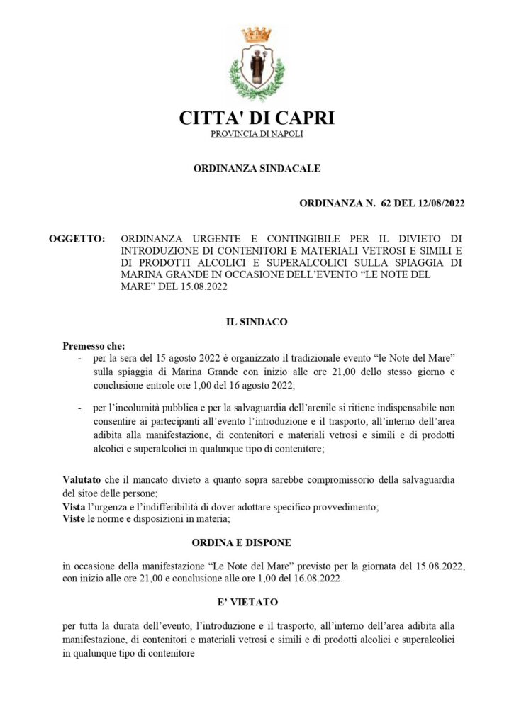 Ordinanza divieto introduzione contenitori e materiali vetrosi e prodotti alcolici sulla spiaggia M. Grande in occasione evento “Le note del Mare” del 15 agosto.