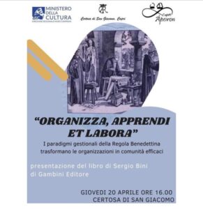 Giovedì 20 aprile 2023, alle 16.00, la Certosa di San Giacomo di Capri, in collaborazione con l’Associazione culturale Ápeiron, presenta il libro di Sergio Bini “Organizza, apprendi et labora. I paradigmi gestionali della Regola Benedettina trasformano le organizzazioni in comunità efficaci“ (Gambini editore, 2022).