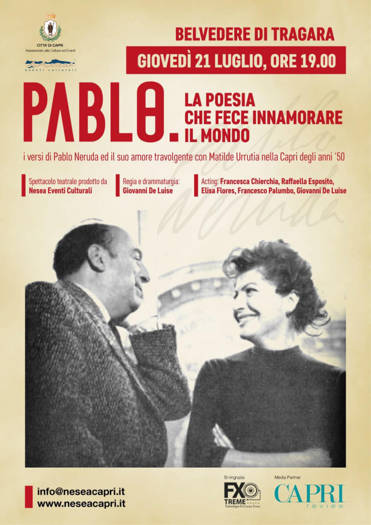 La Nesea Capri – eventi culturali, in collaborazione con l’Assessorato alla Cultura ed Eventi della Città di Capri, è lieta di invitarVi al primo degli itinerari teatrali organizzati per l’estate 2016: Pablo. La poesia che fece innamorare il mondo. L’appuntamento è previsto per giovedì 21 luglio alle ore 19.00 presso il Belvedere di Punta Tragara. Affacciati sulla splendida baia di Marina Piccola, rivivremo la magia della poesia di Pablo Neruda e del suo amore travolgente con Matilde Urrutia. La loro storia, fino ad allora consumata tra incontri furtivi e baci rubati, trovò a Capri i momenti di più esaltante appagamento dei sensi e degli affetti. Pazzo di felicità, il poeta cileno escogitò la più poetica delle invenzioni: un matrimonio al chiaro di luna, fra i giardini e le rocce capresi. Lo spettacolo è gratuito ed aperto a tutti.