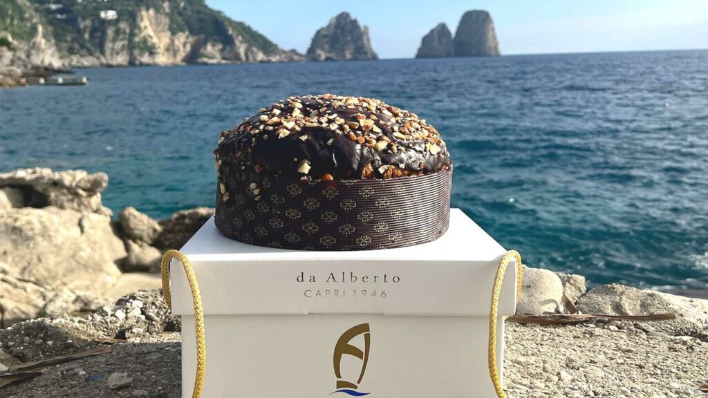 deliziosa novità, davanti al mare di Marina Piccola all’ ombra dei Faraglioni. Il panettone caprese all’ apparenza sembra una torta, di quelle belle, colme di cioccolato. Un delizioso mix di profumi, quelli del panettone artigianale, prodotto con lievito madre a lentissima crescita, e poi gli aromi della torta caprese. Il Panettone alla Caprese, come tutta la produzione artigianale del bar da Alberto, è una vera e propria miniera di sfumature di sapori, partendo, come sempre, dalla scelta della materia prima, elaborata in una nuova filosofia della lievitazione. Il bar da Alberto Capri è famoso nel mondo soprattutto per la tipica pasticceria, legata inevitabilmente alla storia della torta caprese, quella fatta di semplicità e d’ inventiva, che parte dall’ isola azzurra e si diffonde in tutta la terra: il mito della caprese, un cult della tradizione gastronomica internazionale. Oggi questa torta è conosciuta in tutto il mondo e ha più di 100 anni. Il bar da Alberto di Capri vuole festeggiare il mito della torta caprese con questo gustoso panettone e per rendere omaggio alla cultura gastronomica dell’ isola di Capri. Da oggi si può acquistare anche online sul sito: baralbertocapri.com/shop.