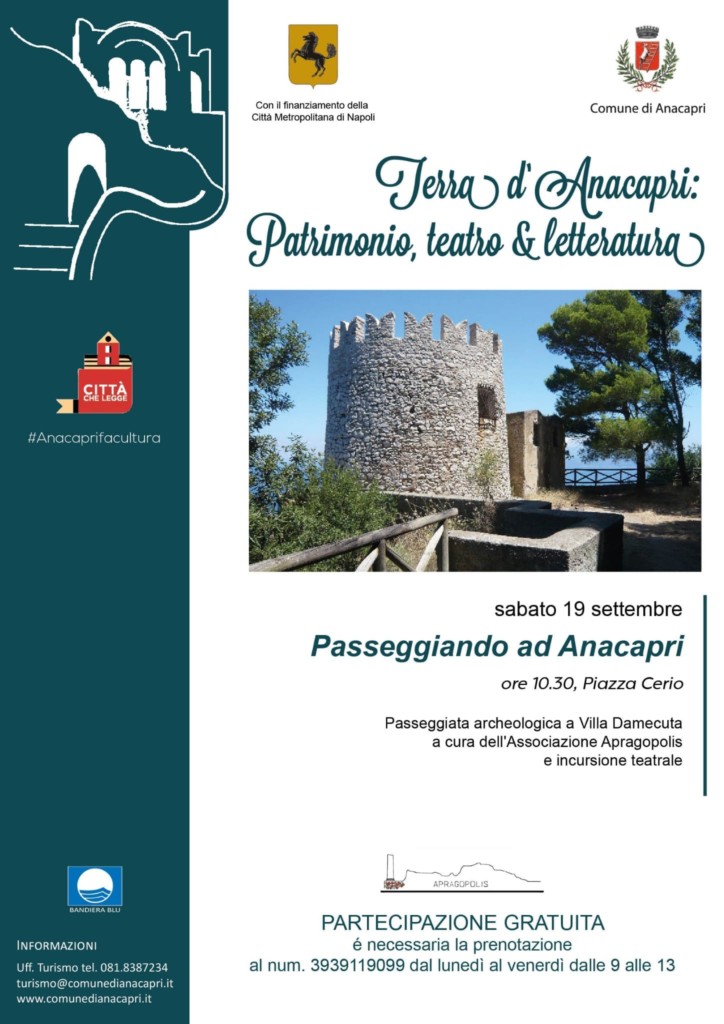 Si terrà sabato 19 settembre, alle 10.30, con partenza da Piazza Cerio ad Anacapri il percorso storico archeologico “Passeggiando ad Anacapri”. L’itinerario a cura dell’Associazione Apragopolis si inserisce nell’ambito della rassegna “Terra d’Anacapri, patrimonio, teatro e letteratura” a cura dell’assessorato alla cultura di Anacapri, guidato da Manuela Schiano, col finanziamento della Città Metropolitana di Napoli.