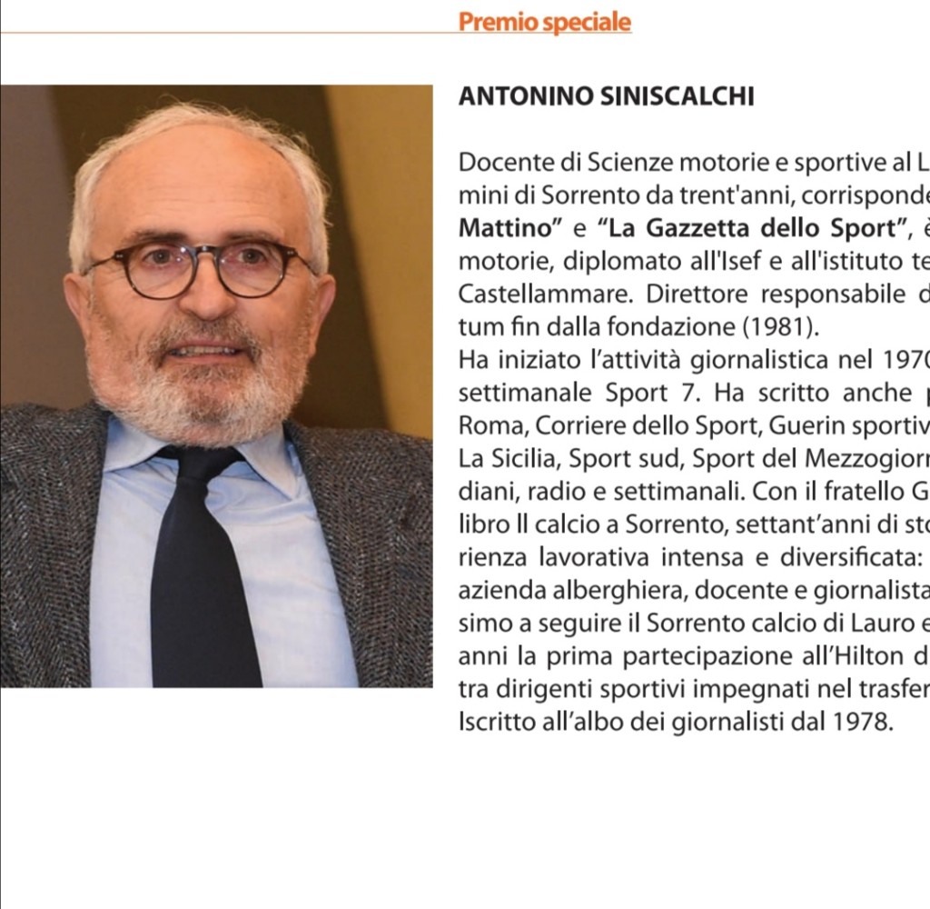 Il giornalista di Il Mattino Antonino Siniscalchi è fra i premiati della venticinquesima edizione del Premio Penisola Sorrentina Arturo Esposito, nella categoria dei premi speciali.