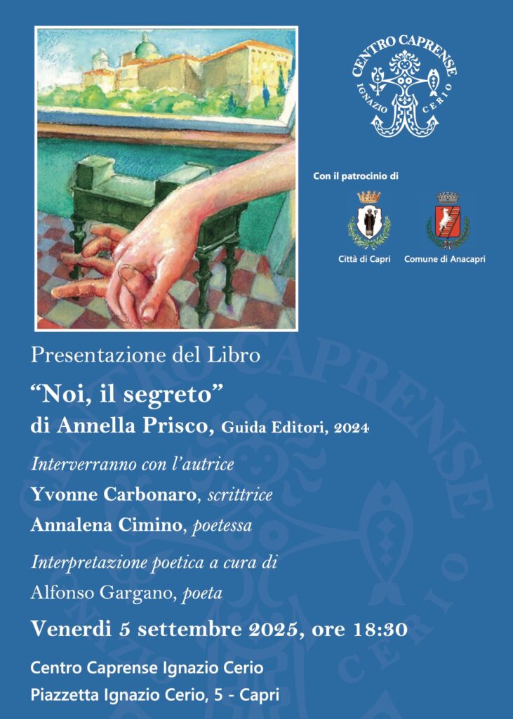 Venerdì 5 settembre ore 18.30 presso il Centro Caprense I. Cerio sarà presentato il libro ” “Noi, il segreto” di Aniella Prisco, Guida Editore.