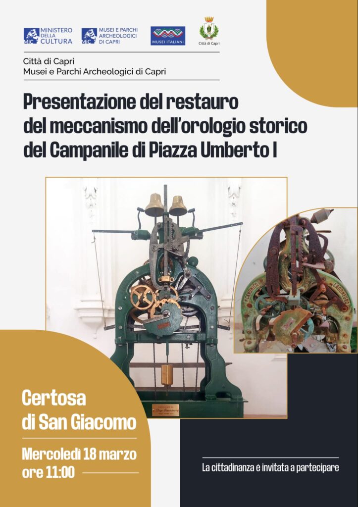 Mercoledì 18 marzo, alle ore 11:00, presso la Certosa di San Giacomo, di concerto con la Direzione dei Musei e Parchi Archeologici di Capri, sarà presentato il restauro del meccanismo dell’orologio storico del Campanile della Piazza, curato dal maestro orologiaio Diego Ferventino.