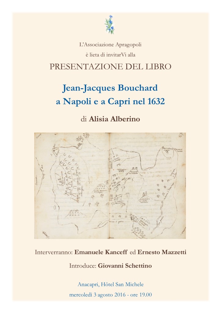 Interverranno il prof. Emanuele Kanceff, di Moncalieri, fondatore del Centro interuniversitario di ricerche sul Viaggio in Italia, uno dei massimi esperti del settore nonché il decano degli studiosi di Jean-Jacques Bouchard, e il professore Ernesto Mazzetti, vice presidente della Società Geografica Italiana, già vicedirettore di Rai 3 e direttore della sua Sede Campania, giornalista e scrittore che ha scelto, ormai da diversi anni, di risiedere ad Anacapri; la sua consistente bibliografia conta diverse opere riguardanti l’isola di Capri.