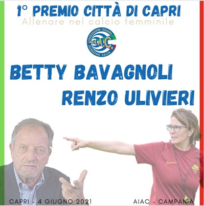 Prima edizione del Premio Capri – Allenare nel calcio femminile, organizzato dal Gruppo Regionale AIAC (Associazione Italiana Allenatori Calcio), attraverso la responsabile nazionale del calcio femminile, dottoressa Valentina De Risi, in collaborazione con l’ASD Anacapri, da anni impegnata nel progetto crescita del calcio sull’isola azzurra, che si terrà presso la sala “Luigi Pollio” il 4 giugno 2021 alle ore 17:00.