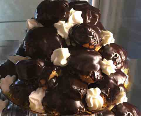 I profiteroles, dicevamo, ovvero bignè riempiti di crema e “vestiti” da salsa al cioccolato e “colorati” dalla panna, nella loro versione più gettonata, farebbero pensare per il “nome” a origini francesi ma in realtà probabilmente stiamo parlando di un dolce nato in Italia. Secondo la storia, infatti, siamo all’epoca di Caterina de’ Medici e della sua corte francese, quando un suo cuoco, Popelini, creò per la prima volta i profiteroles. Ma molto prima, sembra, che nell’italianissima Firenze i pasticcieri toscani erano soliti preparare una piccola montagna di bignè che chiamavano “Il Bongo”. Aldilà dell’ennesimo derby in cucina Italia-Francia, comunque, i profiteroles oggi presentati in quella versione piramide chiamata “croquembouche” potrebbero avere origine da antiche palline di pane ripiene e cotte sotto le ceneri. Solo per rispetto dei miei cinque lettori proverò a dare qualche indicazione per la ricetta.