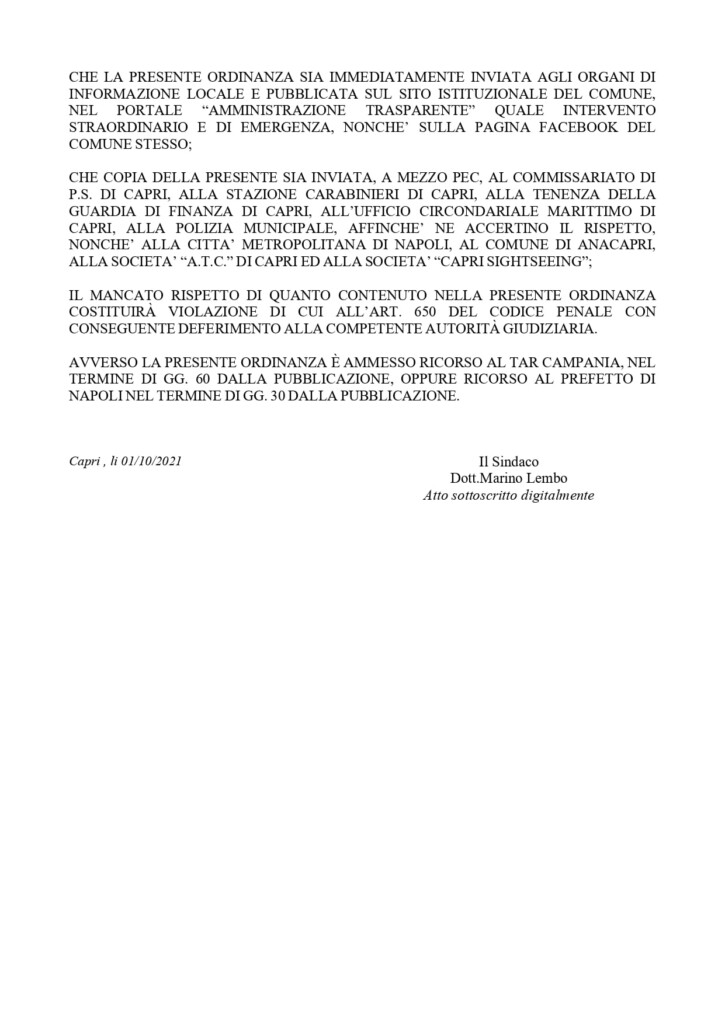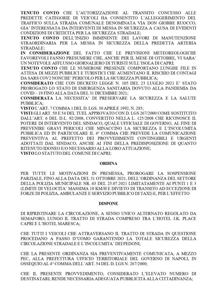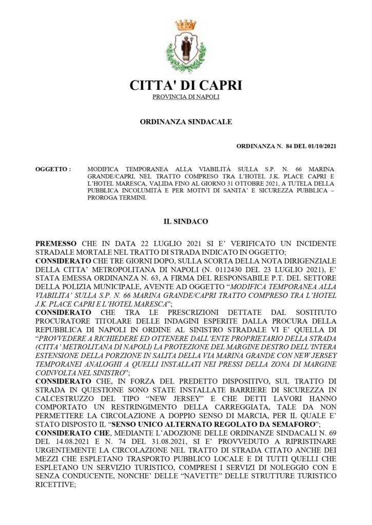 Modifica temporanea alla viabilità sulla S.P. n. 66 Marina Grande/Capri, nel tratto compreso tra l’hotel J.K. Place Capri e l’hotel Maresca, valida fino al giorno 31 ottobre 2021, a tutela della pubblica incolumità e per motivi di sanità e sicurezza pubblica – proroga termini