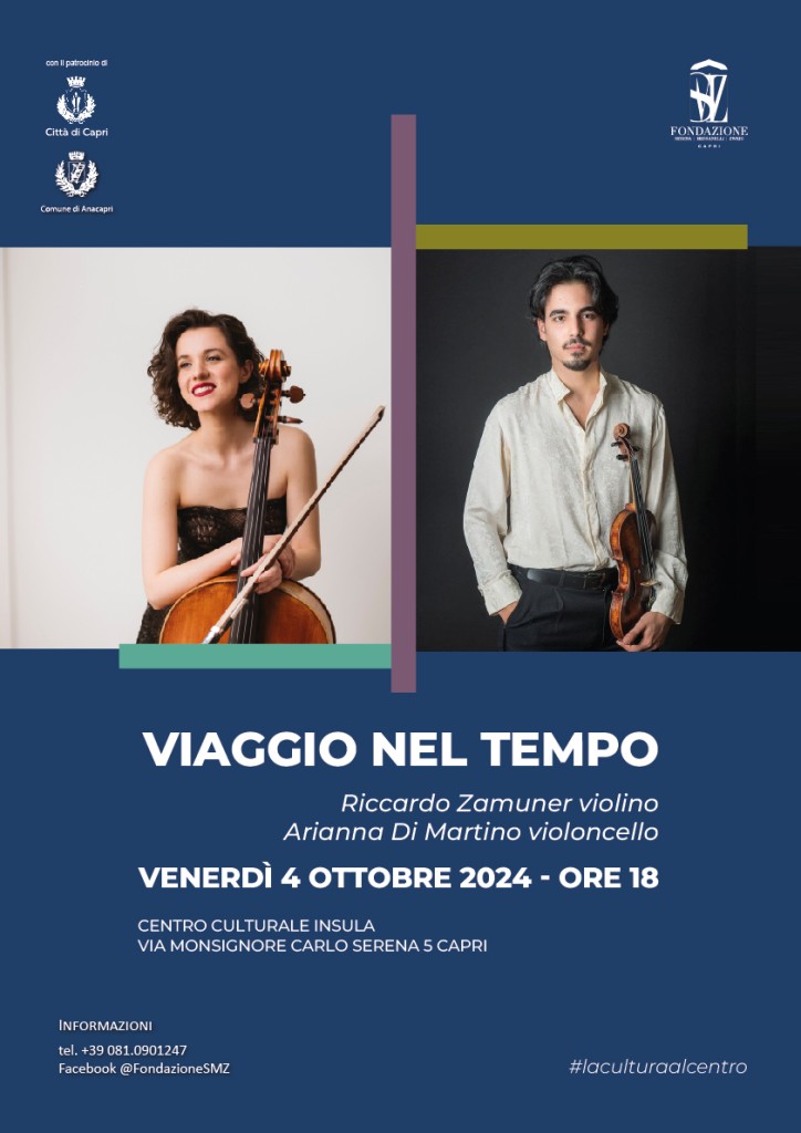 Venerdì 4 ottobre l’esposizione farà da sfondo al concerto ” Viaggio nel tempo” , Riccardo Zamuner al violino e Arianna Di Martino al violoncello con esecuzione di brani di Mozart, Verdi, Massenet, Elgar e Halvorsen.