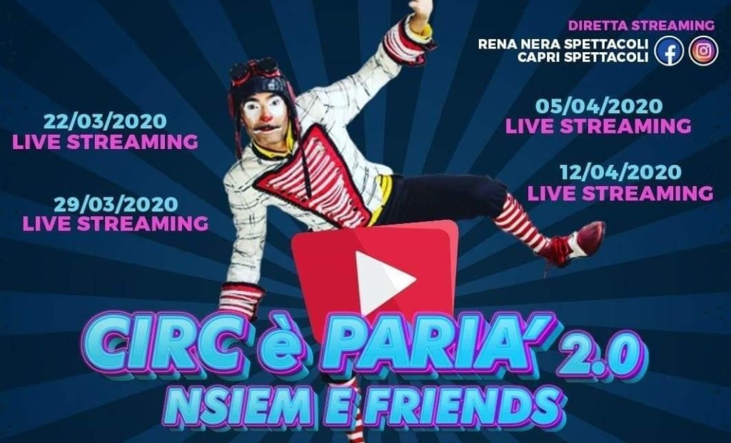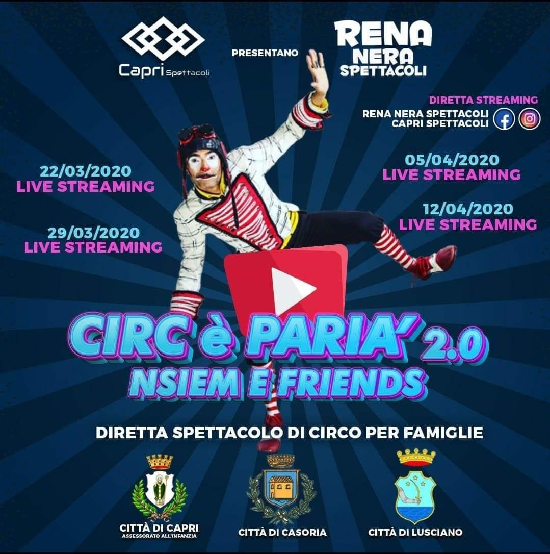 Capri Spettacoli ha realizzato una programmazione (sempre in evoluzione) fino a Pasqua. Dal 15 marzo, ogni domenica alle ore 17.00, va già in onda “Circ e Parià”, uno spettacolo circense per i più piccoli e le famiglie, organizzato con la collaborazione di Rena Nera Spettacoli di Casoria, dove si svolge materialmente lo show. Nell’iniziativa sono coinvolte anche le città di Casoria e di Lusciano che hanno concesso il patrocinio morale. Notevole in successo di pubblico, dai quasi 200 contatti dalla prima fino a superare le 5000 views nelle replica su facebook.