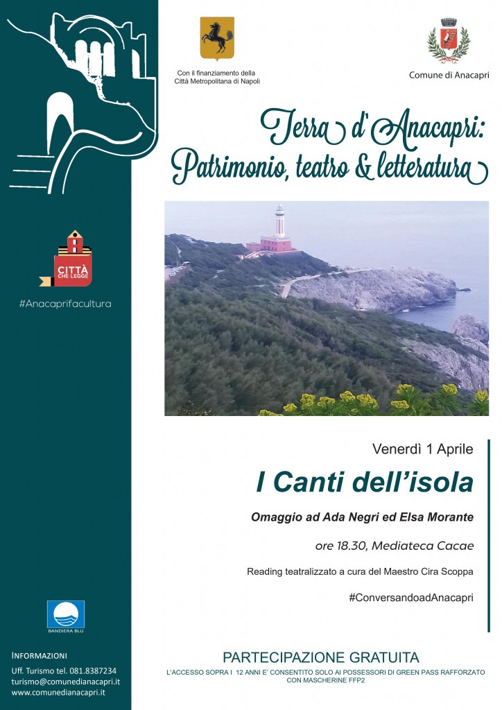 Venerdì 1 aprile un nuovo incontro della serie “Conversando ad Anacapri” nell’ambito della rassegna Terra d’Anacapri. Andrà un scena I CANTI DELL’ISOLA, reading teatralizzato a cura del maestro Cira Scoppa, un omaggio a due terre sorelle quali Capri bene descritta ne I CANTI DELL’ISOLA della poetessa lombarda ADA NEGRI e Procida, gia’ capitale della cultura italiana 2022, ritratta nel celebre romanzo L’ISOLA DI ARTURO della scrittrice romana ELSA MORANTE . Nella prima parte , saranno interpretate 15 poesie tra quelle piu’ famose composte in terra di Anacapri che descrivono la bellezza dei luoghi e la ritrovata pace della poetessa lodigiana mentre la seconda parte , sara’ dedicata ad alcuni stralci tratti dal romanzo procidano . A fare da spezzabattute ai versi anacapresi ed alle memorie di Arturo , vi saranno alcuni accenni cantati di composizioni classiche napoletane eseguiti a cappella cosi’ che parola e voce si fonderanno e confonderanno in un intrecciato estro artistico novecentesco . Il reading vuole essere inoltre un omaggio alle donne artiste e all’arte femminile finalmente riscattate dal secolare ruolo di mera musa ispiratrice.