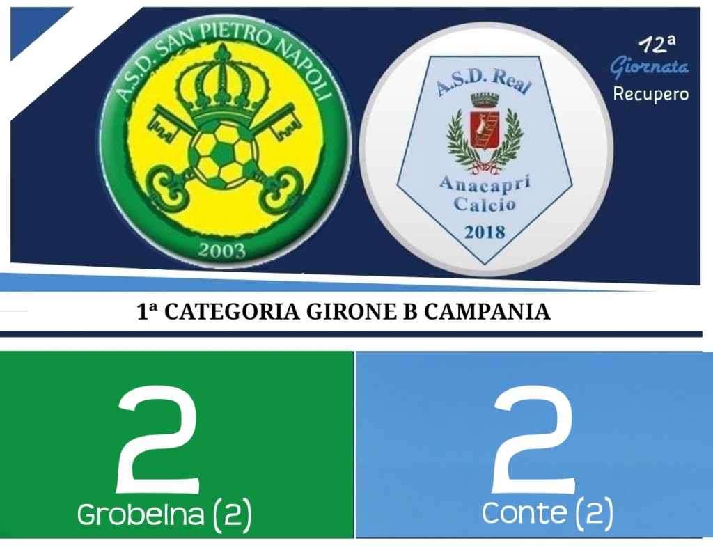 San Pietro e Real Anacapri si dividono la posta nel recupero di campionato del girone B di Prima Categoria. Due doppiette, di Conte per il Real Anacapri e di Grobelna per i padroni di casa, fissano il risultato finale sul 2 a 2.