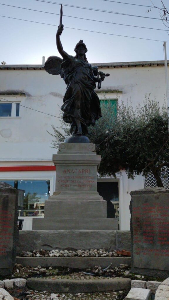 Su questo Monumento sono iscritti i nomi di quei nostri concittadini che vennero chiamati a servire la patria negli anni della Prima e della Seconda Guerra Mondiale. Uomini che lasciarono le loro case, i loro affetti, la loro terra, i loro animali, il poco o il tanto che avevano, e partirono per il fronte, senza purtroppo ritornare. In loro onore, e per immortalare ad eterna memoria il loro sforzo e il loro sacrificio, fu eretto un Monumento, intorno al quale si è poi sviluppato il punto d’accesso della nostra Anacapri.