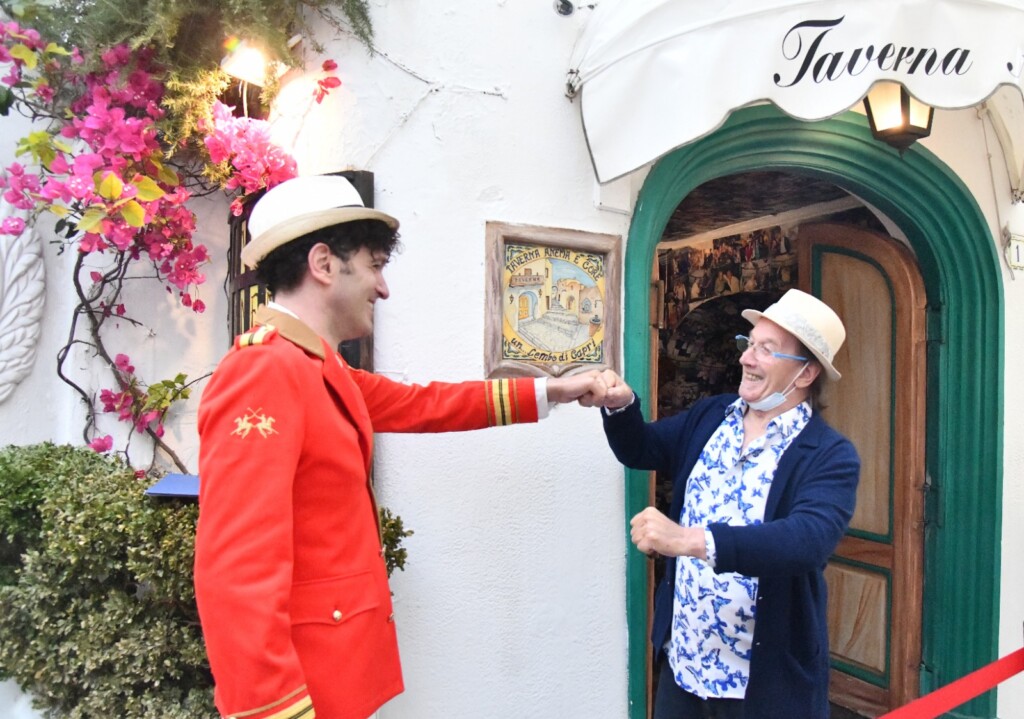 A Capri è veramente iniziata l’ estate con l’ apertura dell’ Anema e Core, anche se non sarà il by night tradizionale che per anni ha vivacizzato le notti capresi, la taverna di Guido e Gianluigi Lembo ieri sera ha siglato ufficialmente la ripresa, adottando una nuovissima versione; niente balli sui tavoli ma accoglienti spazi con tamburelli e mascherine con il logo della taverna e rigidi distanziamenti tra i clienti, che divertiti finalmente hanno potuto varcare il piccolo ingresso per regalarsi qualche ora di spensieratezza ascoltando la buona musica cantata da Guido e Gianlugi che hanno iniziato la serata con le note della famosa canzone con la quale hanno da dato il nome al locale: Anema e Core che è diventato l’ inno dell’ antro canoro caprese. Poi come accade sempre anche personaggi noti, ha voluto duettare sul palco insieme alla band, il famoso cantante rapper Carl Brave che nella sua prima vitaè stato anche un famoso cestista italiano. L’allegria della sala e degli ospiti che hanno assaggiato gli appetizer preparati per il cocktail di apertura è stato il mix giusto per la serata trascorsa sino allo scadere dell’ora imposta