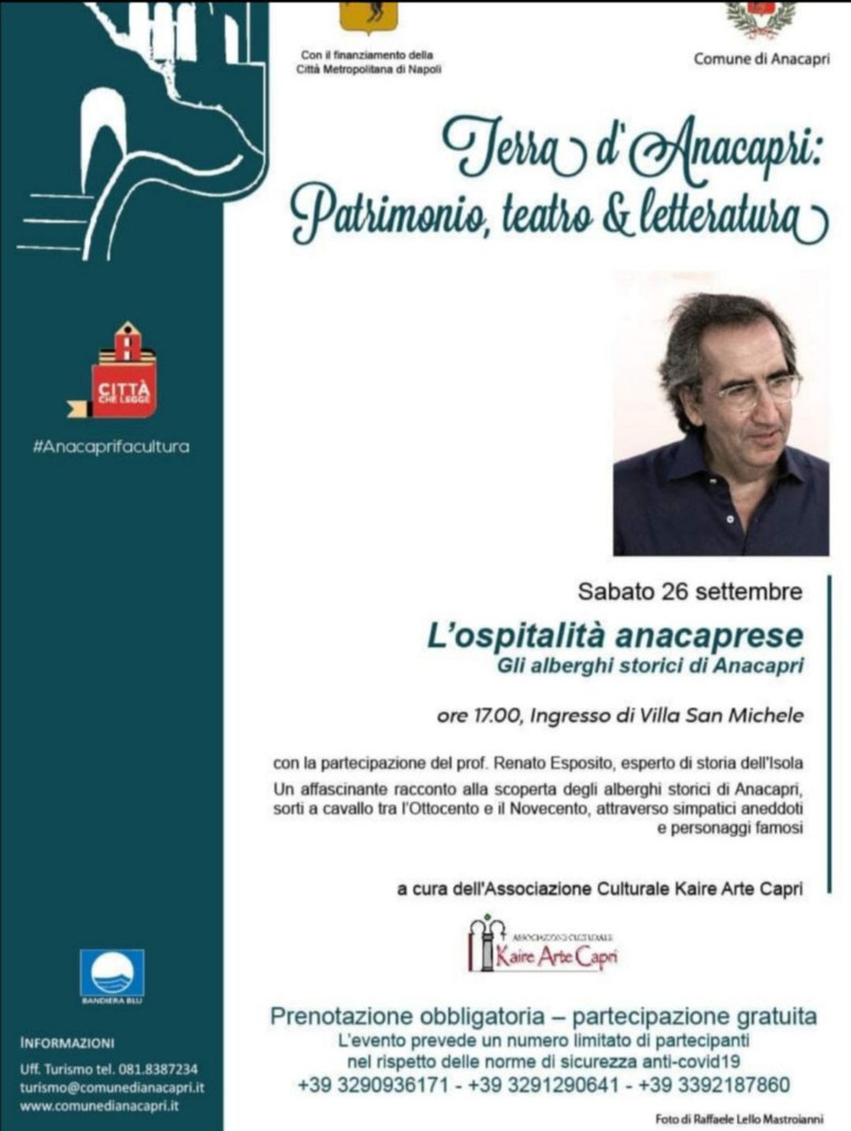 Semper Kaire Arte presenterà il secondo appuntamento di Passeggiando ad Anacapri , sabato 26 settembre alle ore 17 dall’ingresso di Villa San Michele, con un interessante percorso dedicato all’ospitalità anacaprese attraverso gli alberghi storici, con la guida sapiente del prof. Renato Esposito. Lo stesso giorno sarà inaugurata anche la rassegnaAnacaprifateatro da due straordinari artisti: Enzo Vetrano e Stefano Randisi, che porteranno ad Anacapri lo spettacolo di grande successo “Totò e Vicè” , di Franco Scaldati presso l’Auditorium Paradiso alle ore 21.