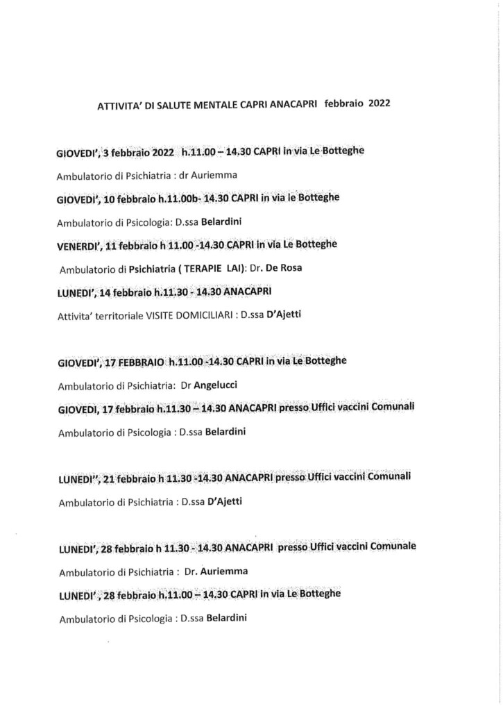 Salute mentale, calendario delle attività ambulatoriali di febbraio a Capri ed Anacapri