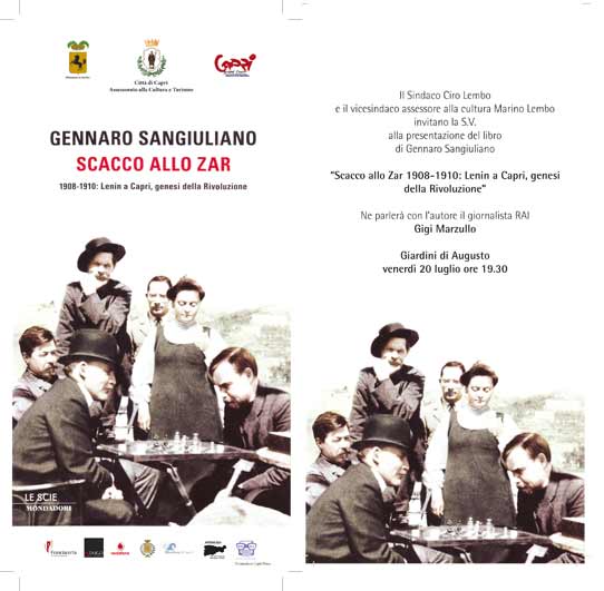 “Scacco allo Zar” è una ricostruzione storica dei giorni capresi di Lenin fra il 1908 ed il 1910, periodo nel quale Lenin, ed altri componenti dell’intellighenzia russa del tempo misero le basi per la genesi della Rivoluzione. Una testimonianza di un periodo cruciale, ricca di informazioni e retroscena, come i legami fra Lenin e l’aristocrazia europea presente sull’isola e delle personalità straniere più influenti della Capri del tempo. Ad introdurre la presentazione, che si terrà sul belvedere dei Giardini di Augusto, ai piedi della villa che fu teatro della storica partita a scacchi fra Lenin e Bogdanov, sotto lo sguardo assorto di Gorky, il Sindaco di Capri Ciro Lembo e l’Assessore alla Cultura Marino Lembo che ha voluto inserire la presentazione del libro di Sangiuliano nella rassegna culturale ed artistica Grand Tour, evento clou dei mesi dell’estate caprese.