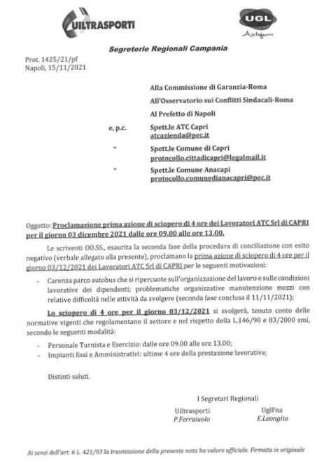 I sindacati UIL e CGL proclamano lo sciopero dell’ATC per il 3 dicembre 2021 dalle ore 9:00 alle 13:00 allegato documento con tutte le motivazioni che hanno portato allo stop degli autobus per 4 ore.