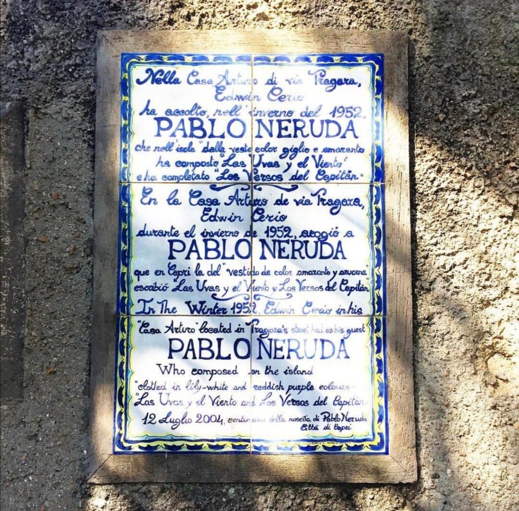 La Capri di Pablo Neruda fu prima di tutto fuoco e amore, alcova e nido per la passione, sino ad allora clandestina, per Matilde Urrutia. L’isola di Capri entrò indelebile nel percorso del poeta soprattutto grazie a lei, la Chascona (la spettinata, per i capelli rossi dalla pettinatura vaporosa), come la chiamava Pablo, che fu compagna di questo intenso periodo d’esilio, e che più avanti avrebbe preso il posto della moglie, la mite e devota Delia, restando con Pablo sino ai drammatici giorni del Golpe e della morte.