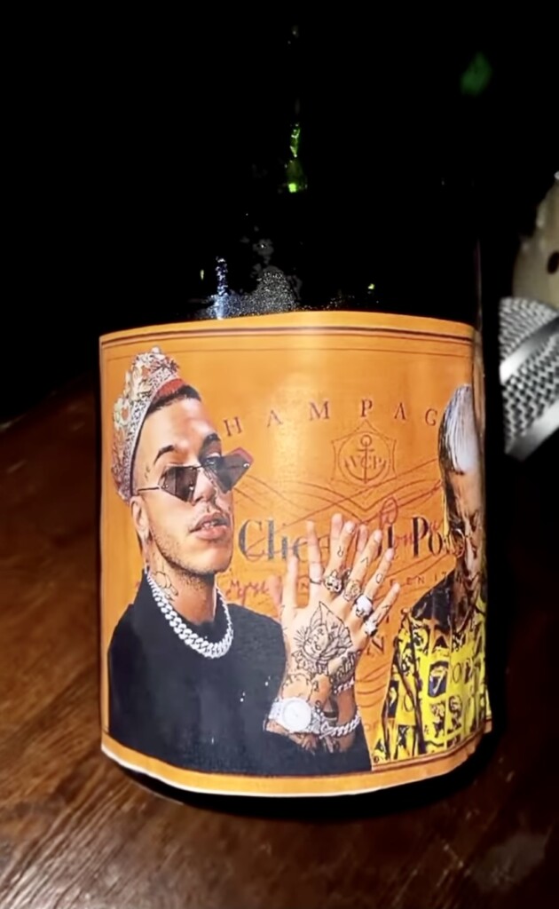 Tamburelli ed etichetta di Champagne personalizzata per il noto rapper, popolarissimo anche sui social dove ha condiviso con i suoi fan qualche momento topico della serata.