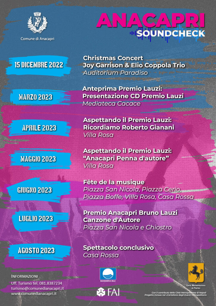 Si inaugura il 15 dicembre “Anacapri sound check” la rassegna promossa dal comune di Anacapri con l’obiettivo di promuovere eventi dal vivo e attività che possano avvicinare le nuove generazioni al linguaggio della musica valorizzando al contempo location di particolare interesse storico, architettonico, naturalistico e paesaggistico al fine di riqualificare l’offerta turistica. Nell’ambito della rassegna sono previsti concerti, workshop, incontri con autore, serate musicali e il Premio Lauzi giunto alla sua quattordicesima edizione. La rassegna si aprirà con il concerto della cantante americana JOY GARRISON organizzato con l’associazione Naima e il marchio Jazz Inn Capri, il 15 Dicembre 2022 alle ore 1930 presso l’Audititorium Paradiso. Joy Garrison, nata a New York e figlia d’arte, comincia a cantare sotto la guida di suo padre Jimmy Garrison (per anni contrabbassista dello storico quartetto di John Coltrane). Ha cantato nei più importanti locali di Manhattan al fianco di musicisti come Barney Kessel, Cameron Brown, Billy Heart, Ronnie Matthews, Hank Jones, Kevin Hubanks, Alberta Hunter solo per citarne alcuni. Il jazz, il gospel, il soul, il blues, il funk sono le sue passioni. Da molti anni in Europa e con sei album all’attivo, svolge la sua attività prevalentemente come solista. Tiene concerti in tutta Europa proponendo la sua musica che attraversa tutte le forme espressive che il suo talento le consente. Per la sua versatilità Joy Garrison è molto apprezzata anche dal pubblico giovanile grazie anche ai numerosi workshop e masterclass che la cantante svolge per associazioni ed istituzioni musicali in tutta Italia. La rassegna proseguirà in primavera con alcuni incontri di preparazione al Premio Anacapri Bruno Lauzi – Canzone d’autore. A fine giugno “Anacapri sound check” prevede l’organizzazione dell’evento internazionale per eccellenza dedicato alla musica : la “Fête de la musique” 2023 che coinvolgerà le associazioni musicali e i musicisti dell’isola in una serata dedicata al divertimento attraverso l’animazione del centro storico anacaprese con postazioni di musica dal vivo. A luglio è la volta del Premio Anacapri Bruno Lauzi – Canzone d’autore: nel cuore di Anacapri, la Piazza San Nicola, si svolge la serata dedicata alla premiazione delle giovani promesse della musica leggera italiana. Il Premio è stato ideato dallo scrittore e giornalista Roberto Gianani per offrire una ribalta alle creazioni inedite dei giovani cantautori italiani. Un’autorevole giuria, composta da artisti affermati e professionisti del settore discografico, valuterà centinaia di partecipanti in cerca di visibilità per il proprio talento e selezionerà i cinque finalisti. Oltre al premio principale, sono previsti premi speciali per il miglior testo, per la migliore interpretazione, per la migliore musica, per il miglior arrangiamento e per la miglior interpretazione di un brano del grande Bruno. Non mancheranno gli ospiti d’onore come nelle scorse edizioni. Edizione dopo edizione, il “Premio Anacapri Bruno Lauzi – Canzone d’Autore” ha acquisito grande autorevolezza nel panorama della canzone italiana d’autore riscuotendo il favore e l’attenzione di importanti musicisti italiani. Visto che il premio è dedicato ad un cantautore, oltre a celebrare la musica si celebra anche la scrittura attraverso l’assegnazione della Penna d’autore ad un personaggio di rilievo del panorama letterario italiano. Lo scorso anno il premio è stato assegnato a Massimo Gramellini. La rassegna, che ha ottenuto il finanziamento e l’inserimento nel cartellone di eventi della Città metropolitana di Napoli, si chiuderà ad agosto con uno spettacolo dal vivo che coinvolgerà giovani anacapresi. “Credo molto in questo progetto di promozione musicale– afferma l’assessore al turismo e cultura di Anacapri Prof.ssa Manuela Schiano, ideatrice della rassegna- Quando si vuol comunicare con i giovani è necessario utilizzare linguaggi quanto più flessibili, e la musica è il linguaggio più flessibile e universale che esista. Non solo, essa è capace di amplificare le emozioni e soprattutto per i giovani può diventare una sorta di specchio che permette di entrare in pieno contatto con se stessi in un momento della vita caratterizzato da numerosi cambiamenti quasi sempre difficili da gestire.”