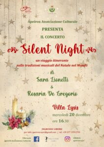 In occasione delle prossime festività natalizie, l’Associazione culturale Ápeiron presenta il concerto “ Silent Night. Un viaggio itinerante nelle tradizioni musicali del Natale nel Mondo”, di Sara Lionetti e Rosaria De Gregorio.