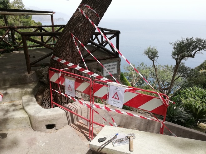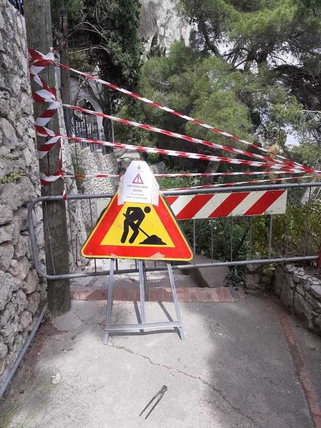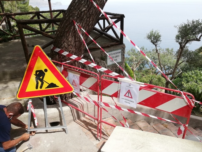 I tecnici hanno immediatamente provveduto a transennare la zone e vietare l’accesso alla strada nel tratto che va da Villa Romita fino alla Grotta di Matermania. Sarà impossibile quindi agli appassionati della passeggiata, sia turisti che capresi, fino al compimento dei lavori di messa in sicurezza, poter godere di quella vista straordinaria, che affaccia su Villa Malaparte e tanto affascina capresi e turisti che vengono da ogni parte del mondo. Lo smottamento ha provocato poi il cedimento strutturale al di sotto della scalinata e quindi il Comune ha provveduto ad installare segnaletiche di divieto di transito già nelle zone che portano a quel percorso da Fuorlovado alla Piazzetta di Tragara, Via Matermania. Tre strade che incrociandosi tra loro portano alla zona oggetto oggi di chiusura. Domani, anche se domenica, ci sarà un ulteriore sopralluogo per consentire lavori urgenti per mettere in sicurezza il costone ed impedire il crollo della scala che si arrampica lungo il pendio per oltre 400m.