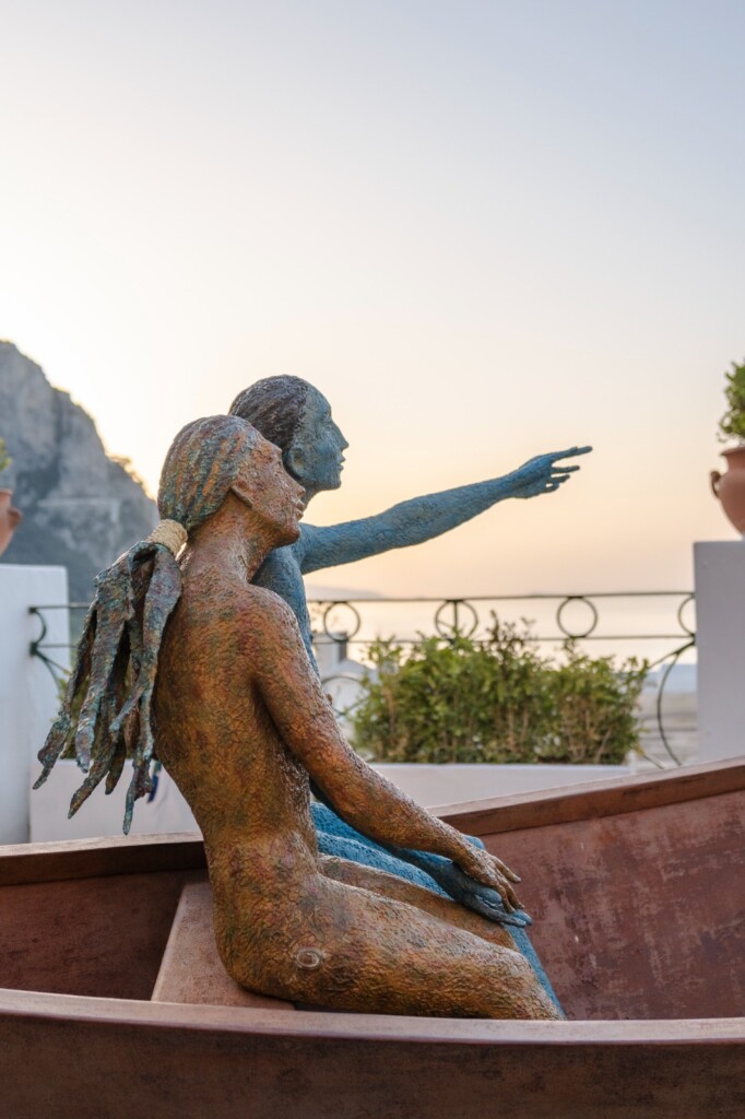 L’imponente scultura in bronzo ritrae due amanti che contemplano la luna, tema prediletto dall’artista, ed è armonicamente immersa nel paesaggio circostante , incorniciata dall’azzurro del mare e del cielo che fanno da sfondo.