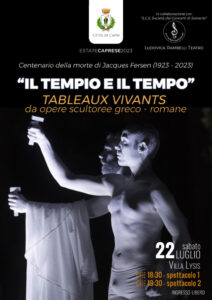 “Il Tempio e il Tempo”, a cura di Paolo Scibilia e Dora De Maio, è costruito con la tecnica dei Tableaux Vivants. Lavoro che nasce nel 2006, grazie a un progetto didattico della Facoltà di Architettura Luigi Vanvitelli: dopo il primo esito fu chiara la sua forza scenica, e da allora ha visto molte e diverse forme. È stato ospite a Napoli del: Museo di Capodimonte, MAN (Museo Archeologico di Napoli), PAN Palazzo delle Arti, del Maggio dei Monumenti, Museo Diocesano, Chiesa di Donnaregina Nuova; di Benevento Città Spettacolo, in giro per l’Italia in musei, gallerie, piazze, sagrati, Istituti Italiani di Cultura all’estero, riscuotendo sempre ampissimi consensi di pubblico e di critica; conservando sempre la sua suggestione e la sua magia per un pubblico tanto più attento e complice, quando non avvertito della epifania di un lavoro semplice, rigoroso, artigianale. Il gruppo “Tableaux Vivants” è invitato spesso dall’Accademia di Belle Arti di Napoli, nell’ambito del progetto “L’Accademia Svelata”, a condurre laboratori per gli studenti dei diversi corsi sul tema dei Tableaux Vivants. Mette in scena le rappresentazioni plastiche, tutte costruite sulla tecnica dei Tableaux Vivants”:”Caravaggio” (su 24 opere pittoriche di Michelangelo Merisi da Caravaggio), “Salvi per Miracolo” (ispirato alle edicole sacre della devozione partenopea), “Mysterium” (sugli affreschi ritrovati della Villa dei Misteri di Pompei). “Il Tempio e il Tempo” è uno spettacolo di grande impatto emotivo che consente di vedere composte sotto gli occhi del pubblico opere scultoree greco-romane, provenienti per la maggior parte dal MAN (Museo Archeologico di Napoli), realizzate con i corpi di attori, in posa plastica, e l’ausilio di oggetti di uso comune e stoffe drappeggiate.