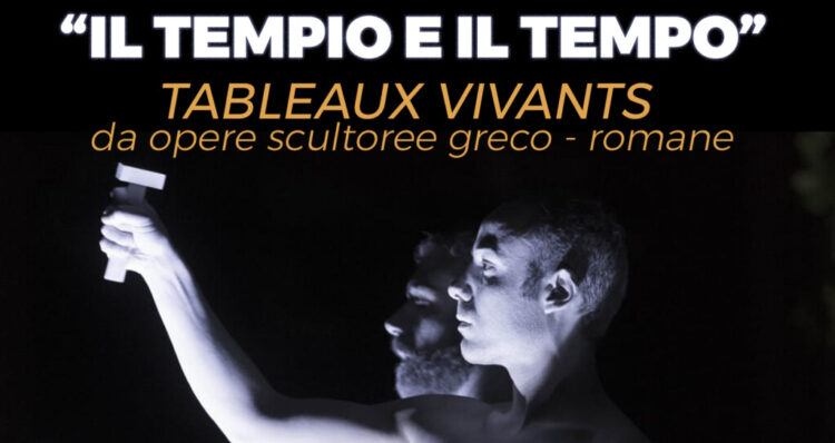 “Il Tempio e il Tempo”, a cura di Paolo Scibilia e Dora De Maio, è costruito con la tecnica dei Tableaux Vivants. Lavoro che nasce nel 2006, grazie a un progetto didattico della Facoltà di Architettura Luigi Vanvitelli: dopo il primo esito fu chiara la sua forza scenica, e da allora ha visto molte e diverse forme. È stato ospite a Napoli del: Museo di Capodimonte, MAN (Museo Archeologico di Napoli), PAN Palazzo delle Arti, del Maggio dei Monumenti, Museo Diocesano, Chiesa di Donnaregina Nuova; di Benevento Città Spettacolo, in giro per l’Italia in musei, gallerie, piazze, sagrati, Istituti Italiani di Cultura all’estero, riscuotendo sempre ampissimi consensi di pubblico e di critica; conservando sempre la sua suggestione e la sua magia per un pubblico tanto più attento e complice, quando non avvertito della epifania di un lavoro semplice, rigoroso, artigianale. Il gruppo “Tableaux Vivants” è invitato spesso dall’Accademia di Belle Arti di Napoli, nell’ambito del progetto “L’Accademia Svelata”, a condurre laboratori per gli studenti dei diversi corsi sul tema dei Tableaux Vivants. Mette in scena le rappresentazioni plastiche, tutte costruite sulla tecnica dei Tableaux Vivants”:”Caravaggio” (su 24 opere pittoriche di Michelangelo Merisi da Caravaggio), “Salvi per Miracolo” (ispirato alle edicole sacre della devozione partenopea), “Mysterium” (sugli affreschi ritrovati della Villa dei Misteri di Pompei). “Il Tempio e il Tempo” è uno spettacolo di grande impatto emotivo che consente di vedere composte sotto gli occhi del pubblico opere scultoree greco-romane, provenienti per la maggior parte dal MAN (Museo Archeologico di Napoli), realizzate con i corpi di attori, in posa plastica, e l’ausilio di oggetti di uso comune e stoffe drappeggiate.