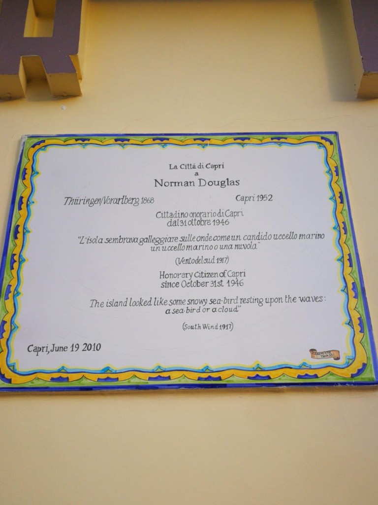 Con questa frase, tratta da “South Wind” ed impressa su una mattonella commemorativa posta sulla facciata del Bar Funicolare, è iniziata la passeggiata “Sulle tracce di Norman Douglas”, tenuta dal Prof. Renato Esposito, patrocinata dal Comune di Capri ed inserita nella rassegna “Buon compleanno Norman”. Questa manifestazione, curata da Vincenzo Starita in collaborazione con l’ArcheoClub di Massa Lubrense e giunta ormai alla sua VIII edizione, si pone l’obiettivo di raccontare e valorizzare le bellezze della “Terra delle Sirene”, di cui lo stesso Douglas onorò lo spirito in molte delle proprie opere. Il 2018 marca peraltro il centocinquantesimo genetliaco dell’autore, che infatti nacque a Thüringen, cittadina austriaca nello stato federale del Voralberg, nella notte tra l’8 e il 9 dicembre 1868.