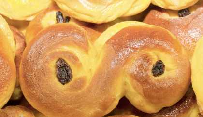 13 dicembre arriva “Santa Lucia” ed il profumo di dolci si unisce ad alberi, presepi, lucine che si accendono e tutto quanto ci sta accompagnando a Natale. Festività che saranno diverse, anzi no, saranno sempre le nostre amate festività da trascorrere in casa ed in famiglia. E proprio il giorno di Santa Lucia, tradizionalmente, ci ha sempre fatto da “campanello” alla frase del mio prezioso amico Franco “Mo’ vene Natale!”. Lascio ad altri, più esperti e competenti del sottoscritto, semplice manovale della scrittura, o “scribacchino” che dir si voglia, servitore dei suoi cinque lettori, un più approfondito racconto della leggenda di Santa Lucia (che tra le tante cose salvò i bambini di Verona da una grave malattia oculare e da quel momento ogni 13 dicembre i più piccoli ricevono da Santa Lucia dolci doni) e ci trasferiamo, appunto, sulla parte golosa. La pasticceria dedicata alla santa del 13 dicembre è varia e vasta, a meritare una speciale menzione, secondo il nostro “Gusto” è “La Cuccia”, dolce caratteristico della Sicilia. Una prelibatezza a base di grano e ricotta che nasce, secondo “la storia della pasticceria”, da un antico episodio, quando durante una grave carestia, nel porto di Siracusa (o di Palermo in questo senso esistono due versioni) arrivò un’imbarcazione che trasportava grano, regalando quindi un’improvvisa fortuna, con la quale il popolo con aggiunta di sale e olio si sfamò. E per “festeggiare” i siciliani, (o meglio le siciliane…) inventarono una ricetta prelibata aggiungendo, al grano cotto, altri ingredienti come il cioccolato ed i pistacchi ma anche il vin cotto, la crema di ricotta o il miele e la cannella. Secondo la tradizione è questo “il piatto” da mangiare il 13 dicembre rinunciando per un giorno a pane e pasta. Sempre rimanendo in Puglia e nel Sud, vanno ricordati gli “Occhi di Santa Lucia”, squisiti taralli preparati con farina, olio d’oliva e vino bianco e poi ricoperti con una glassa bianca a base di acqua e zucchero. Il segreto è sfornarli prima del tempo in modo che mantengano morbidezza rispetto ai taralli salati. Tra le varianti degli “Occhi di Santa Lucia” ci sta un tocco di anice o vaniglia. Per rispettare la tradizione si mangiano la prima volta il 13 dicembre e poi per i restanti giorni del mese di dicembre. Salendo “su al Nord”, invece, ci si imbatte in Veneto ma anche in Lombardia in dolcetti di pasta frolla, semplici ma prelibati e chiamati “i dolci di Santa Lucia”. Prendiamo un aereo e andiamo in trasferta mentale (di questi tempi l’unico viaggio che possiamo fare…) con destinazione la Svezia. E qui, in terra scandinava, in onore della festa di Santa Lucia ci si diletta a preparare (e mangiare) i “Lussekatter”. Si tratta di morbidi panini allo zafferano con uva sultanina. Per prepararli le belle svedesi (sono tutte belle fateci caso…) mescolano il latte tiepido con il lievito, poi aggiungono farina setacciata, zucchero, uovo, zafferano e giusto un pizzichetto (come dice l’esilarante Enrico Montesano nei panni di un’attempata nonnina) di sale. Si lavora fino ad ottenere un impasto liscio e poi si lascia lievitare con paziente attesa anche di oltre due ore. L’impasto viene poi suddiviso come fossero tanti salsicciotti di trenta centimetri, per poi arrotolarli in direzioni opposte mentre al centro delle due spirali va messa l’uva sultanina. Per coloro i quali hanno seguito alla lettera le istruzioni dovrebbe venir fuori una sorta di “numero otto” con i chicchi di uva sultanina a formare degli occhi, in onore di Santa Lucia. La lievitazione viene poi completata per un’altra trentina di minuti, poi si spennellano con l’uovo e poi in forno per poco meno di mezz’ora a duecento gradi.