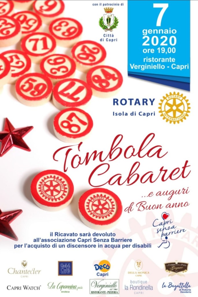 Giochi e spettacolo a Capri per salutare in bellezza le festività natalizie e di inizio anno. Il Rotary Isola di Capri, con il patrocinio della Città di Capri, organizza una Tombolata Cabaret. L’evento è in programma questa sera alle ore 19.00 al ristorante Verginiello.