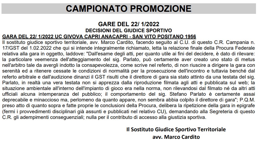 Questo è quanto stabilito dal Giudice Sportivo Territoriale, avv. Marco Cardito.