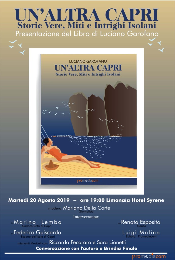 Sarà presentato martedì 20 Agosto alle 19.00, nella Limonaia dell’Hotel Syrene, l’ultimo libro di Luciano Garofano: “Un’altra Capri, storie vere, miti e intrighi isolani” edito dalla Promediacom, con la prefazione del prof. Renato Esposito. Interverranno Marino Lembo, Sindaco della Città di Capri, Renato Esposito, storico, Federico Guiscardo, esperto dell’isola di Capri e Luigi Molino, editore.