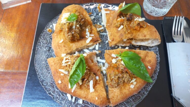 Ma sia ad Aversa che a Napoli, nei due locali targati “Isabella De Chaim – Pizza Fritta”, il primo ampio e numericamente pronto a fronteggiare eventi dai flussi record, il secondo nella Sanità, più raccolto, come vuole un quartiere dagli spazi suggestivi ma più intimi, una menzione a parte merita il menù “Vegan Special”. Una proposta completa, che rende giustizia a chi vuole mangiare “no meat”, per scelta o per esperimento, per cambiare o semplicemente per gustare con maggiore leggerezza, sapori della tradizionale pizzeria, anticipata magari da un fritto misto. E questo rende meritorio di segnalazione la proposta partorita da Isabella De Cham, ovvero, né integralista solo vegan, ma nemmeno quelli che in fondo al menù, consentono una piccola scelta per l’unico commensale vegetariano o vegano della tavolata, ma bensì un percorso consapevole, completo, sul quale possono indirizzarsi anche carnivori e onnivori, che facendo compagnia ai vegani, optano per un menù diverso. E così si inizia con un tris di fritti vegan, alias frittatina, crocchè e arancino,