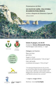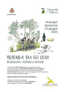 A dare il via a questa speciale due giorni dove i temi centrali che si tratteranno riguardano la tutela e la cura dell’ambiente, il verde, la natura e il recupero delle tradizioni attraverso la coltivazione degli antichi oliveti, il tutto racchiuso nelle pagine del libro “Gli Olivi di Capri, una storia di agricoltura eroica” scritta e disegnata da Simonetta Capecchi, edito da Electa 2024. La presentazione avrà luogo Sabato 21 Giugno alle ore 18.00 negli spazi della Fondazione Serena Messanelli Zweig, in via Monsignor Carlo Serena 5, a pochi passi dalla piazzetta. Dialogano con l’autrice: la giornalista Bianca De Fazio, Angelo Lo Conte agronomo dell’Associazione “L’Oro di Capri” e Carlo Lelj Garolla coordinatore del progetto “L’Oro di Capri”. Un’atra location invece è il luogo scelto per la seconda giornata, che si terrà ad Anacapri con La Merenda tra gli Olivi: Passeggiata, assaggi e disegni. l’appuntamento è fissato per domenica 22 giugno alle 9.30 sul versante del faro, a Pino dei Monaci