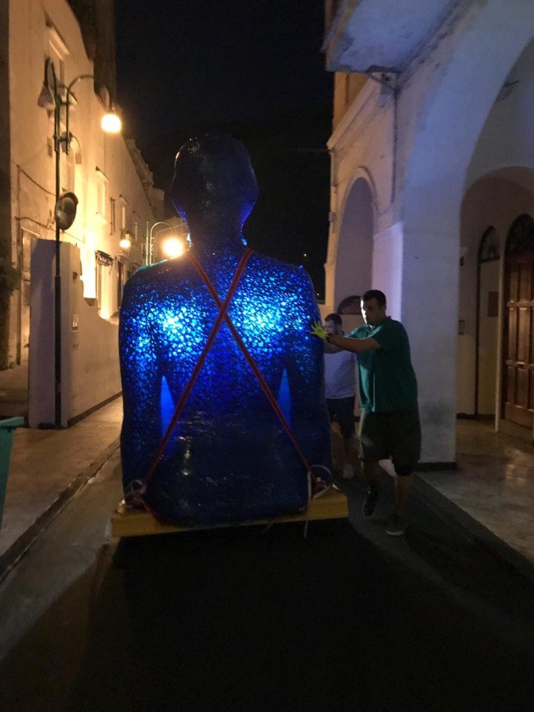 Protagonista dell’ iconica Piazzetta di Capri quest’estate sono le sculture del sud coreano Seo, celebre per le sue opere di grandi dimensioni raffiguranti figure umane utilizzando catene di acciaio inossidabile ricavate da macchinari industriali e biciclette. Da Venezia a Capri, Liquid Art System ha scelto di portare nella Piazza, salotto del mondo, le sculture, tratta dalla serie Meditation, di Seo. Da poco terminata infatti la mostra “Dystopia”, nella Chiesetta della Misericordia della Serenissima, una grande “maschera” dell’artista coreano è stata esposta da inizio estate nel cuore di Capri, proprio a due passi dal Campanile. Da oggi invece un’altra imponente scultura di Seo, Meditation 1039, raffigurante un mezzo busto, accoglie visitatori, vacanzieri ed isolani al loro arrivo in Piazzetta. Installata stamane all’alba, al riparo dalle flotte di turisti che ogni giorni popolano quest’area dell’isola, la scultura, dalla postura quasi sacrale, dialogherà infatti sino a fine estate con uno dei luoghi di Capri più frequentati e fotografati.