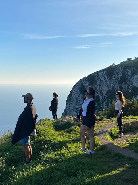 Uno splendore e porto con me un carico di dottorandi di architettura e scienze dell’informatica alla Federico II. Praticamente il meglio della generazione futura. Vengono dalla Cina, dalla Turchia, da Parigi. Si chiamano Simon, Sila, Bercu, Merjam, Lu, Hu, Gessica. Per loro era la prima volta a Capri ( e poi a Ravello). Erano tutti come Alice nel Paese delle Meraviglie. Occhi spalancati sull’Arco Naturale, visto da sotto salendo dalla grotta di Matermania.