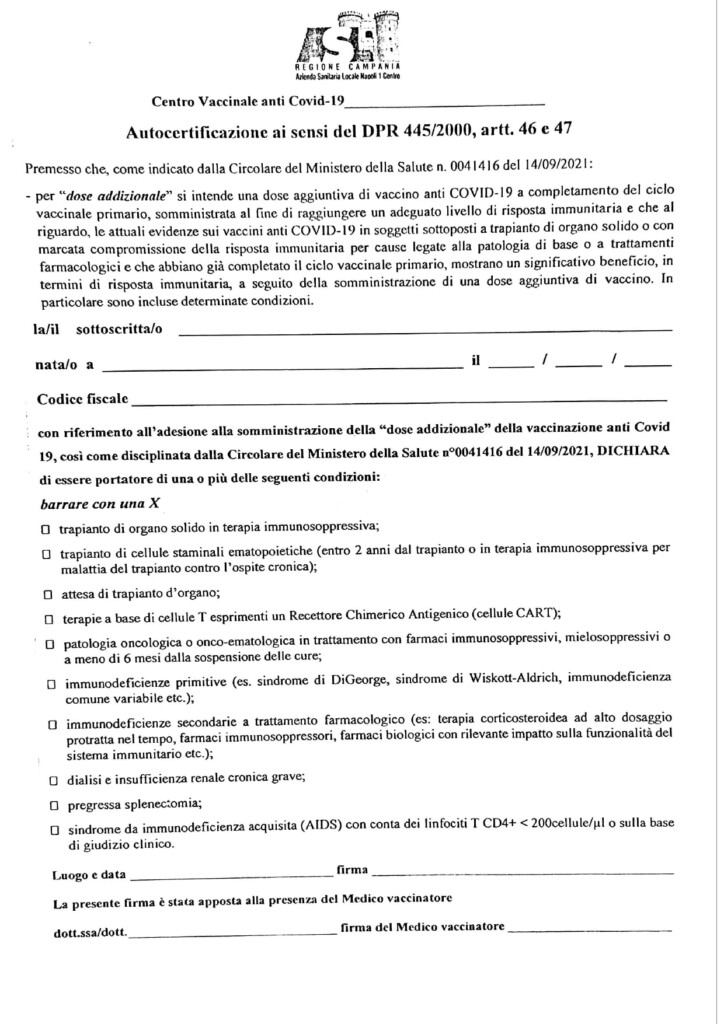 Venerdì 1 ottobre è prevista una seduta vaccinale presso la Tendostruttura S. Costanzo di Capri. Agli interessati perverrà sms di convocazione da parte dell’ASL NA 1 Centro.Oltre all’ordinaria somministrazione di I e II dose per chi non ha ancora ultimato il ciclo vaccinale primario, possono accedere alla III dose coloro i quali, in autocertificazione, si trovano nelle condizioni patologiche di cui all’allegato.