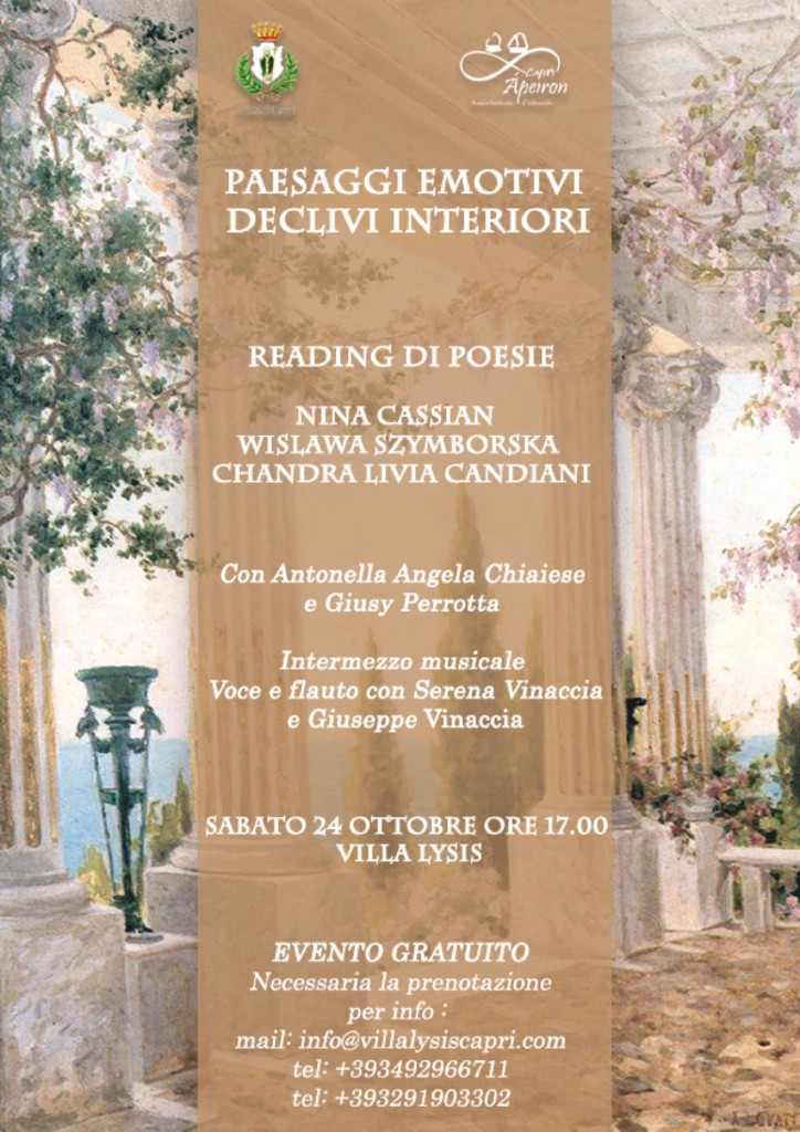 Sabato 24 ottobre alle ore 17:00 l’Associazione culturale Apeiron presenta Paesaggi emotivi declivi interiori, un reading di poesie dedicato a tre grandi voci femminili moderne: Nina Cassian – Wislawa Szymborska – Chandra Livia Candiani.
