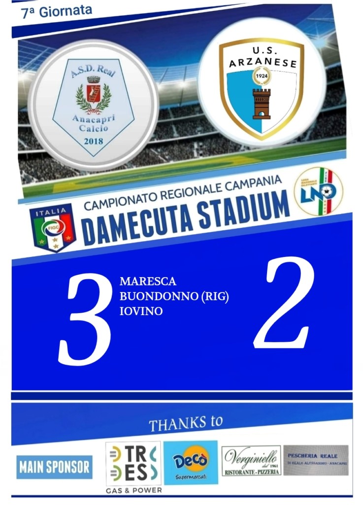 Vittoria epica, così come da definizione di mister Staiano, per il Real Anacapri che nella settima giornata del campionato di Prima categoria supera l’Arzanese per 3 a 2 al termine di una gara in salita e continua la sua corsa nelle posizioni nobili di una classifica dove, almeno per 24 ore, guarderà tutti dall’alto.